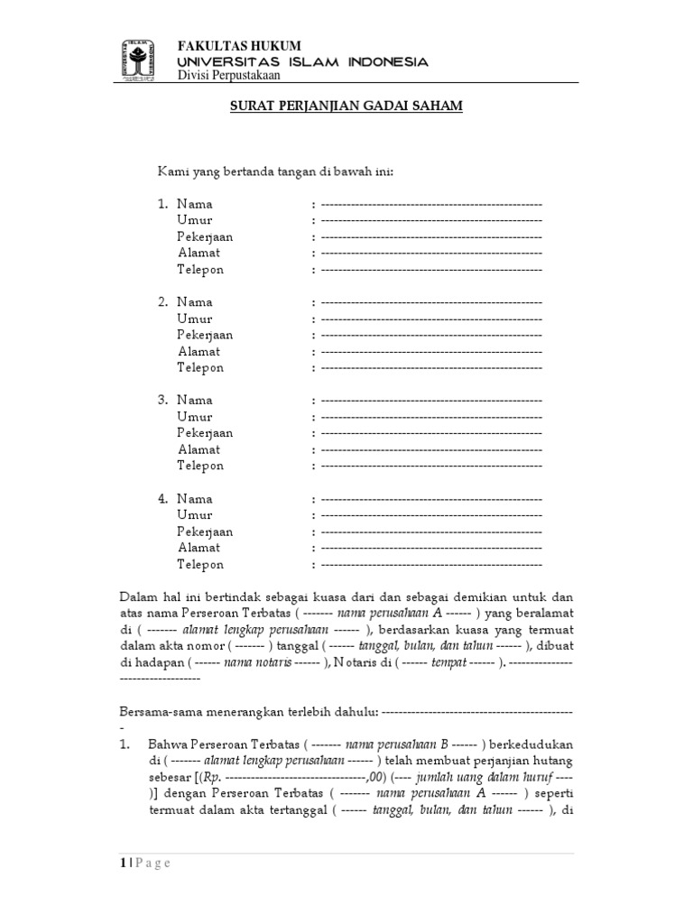Contoh Surat Perjanjian Gadai Saham FHUII